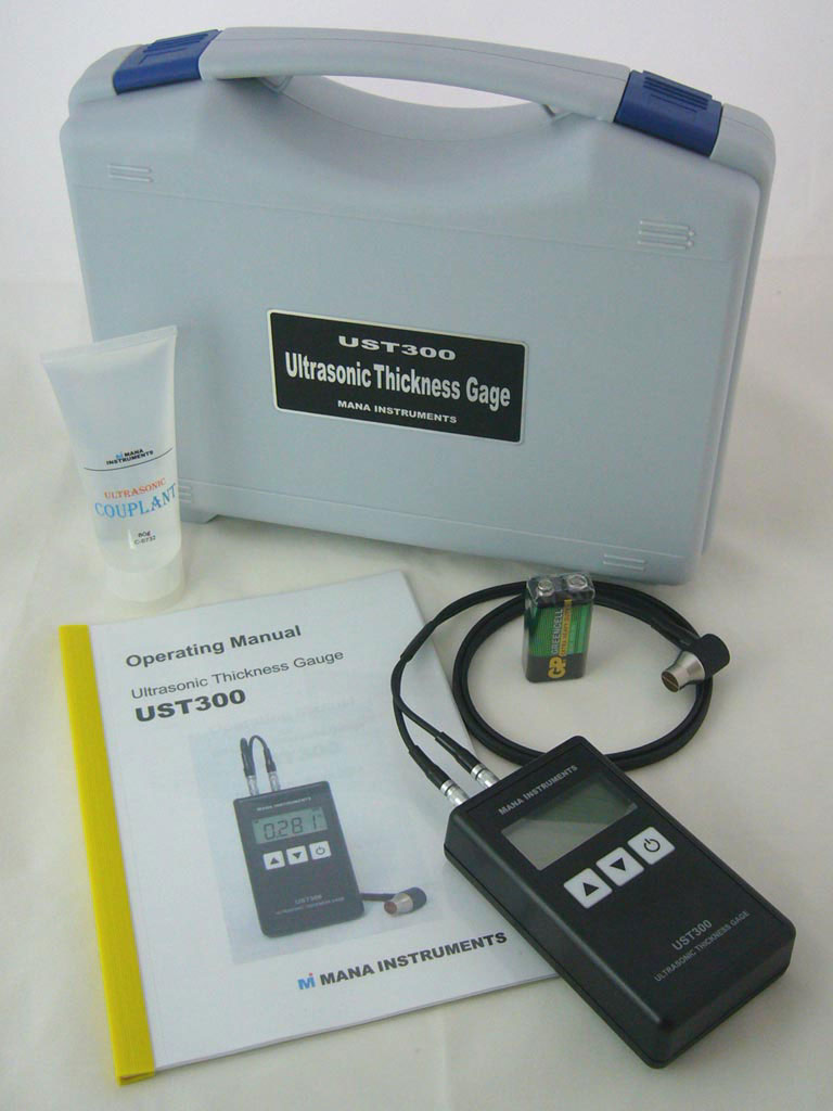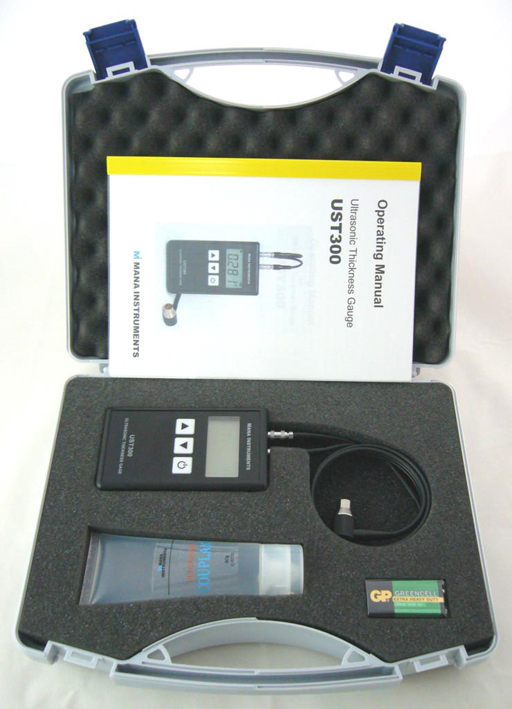 The UST300 ultrasonic thickness gauge. Handy. Pocket sized. Digital display with integrated check of the function of the gauge for operational readiness, continuously indicates battery status, condition of the coupling. exceeding the measuring range. High display stability by means of “averaging”. The sound velocities can be pre-programmed. It will be logged in memory until changed. Measured values and user information are shown on a large, easy–to–read LC display. A display back light (optional) ensures easy reading of screen data, in poorly-lit conditions.